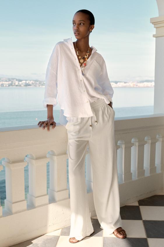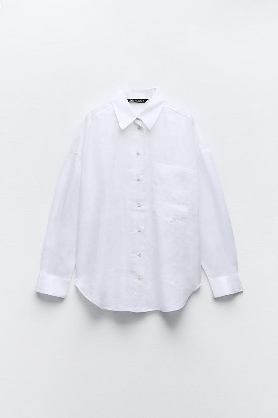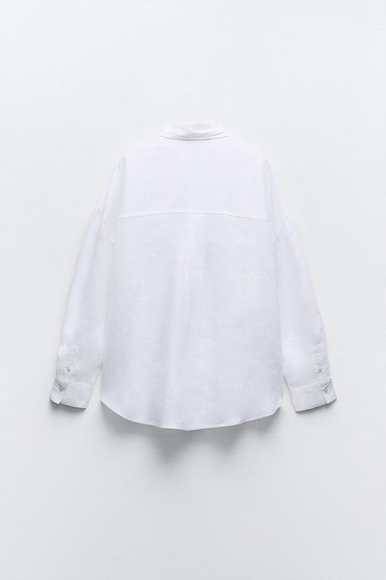 Top blanco de lino a la altura de la cintura con manga tres cuartos.