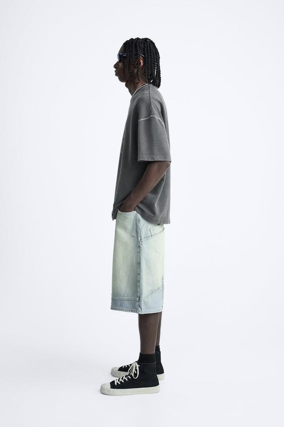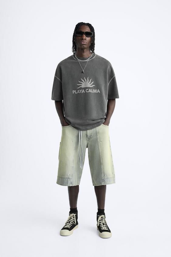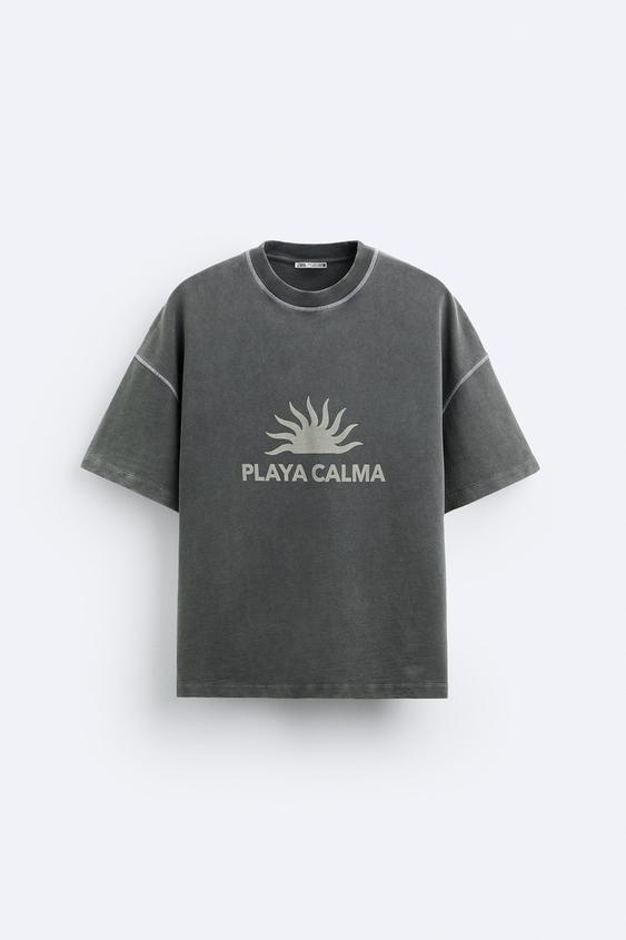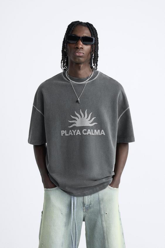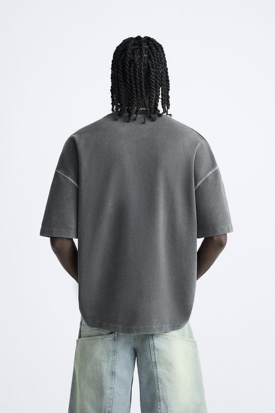 Camiseta boxy fit confeccionada en tejido compacto de algodón. Cuello redondo y manga corta. Estampación frontal combinada a contraste. Efecto lavado.