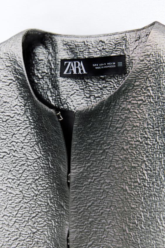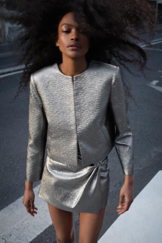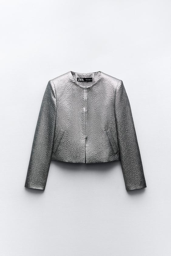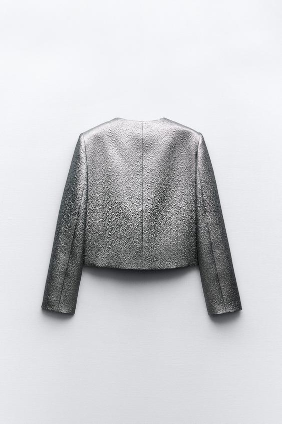 Chaqueta de cuello redondo y manga larga con hombreras. Bolsillos delanteros de vivo. Cierre frontal oculto con corchetes.