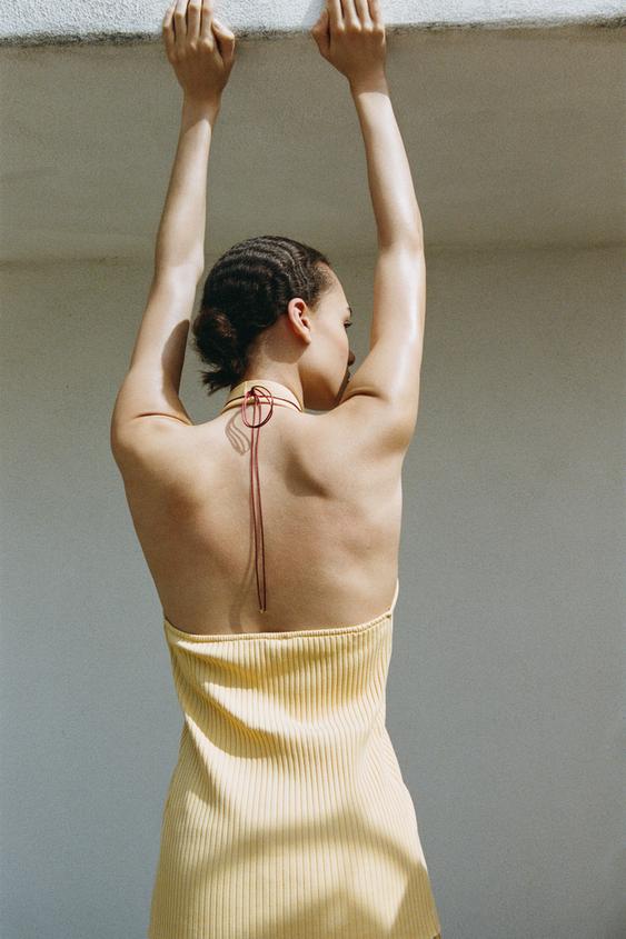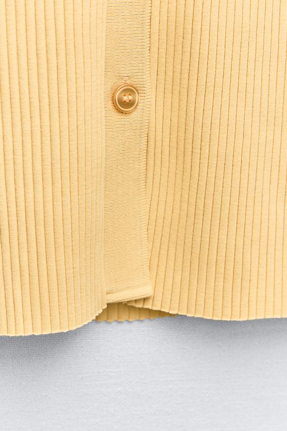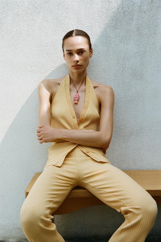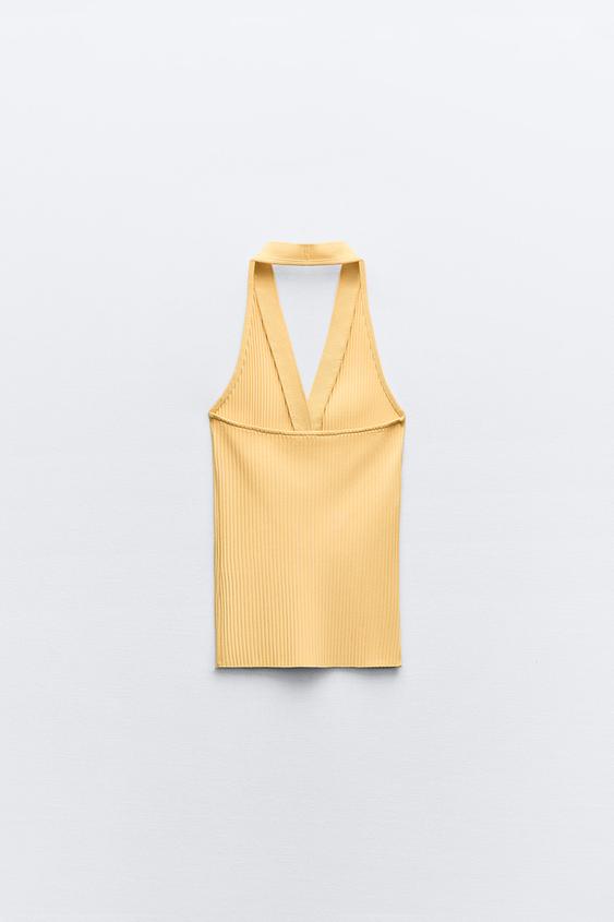 Top chaleco de cuello halter y escote pico acabado en rib a tono. Tejido en canalé. Cierre frontal con botones.