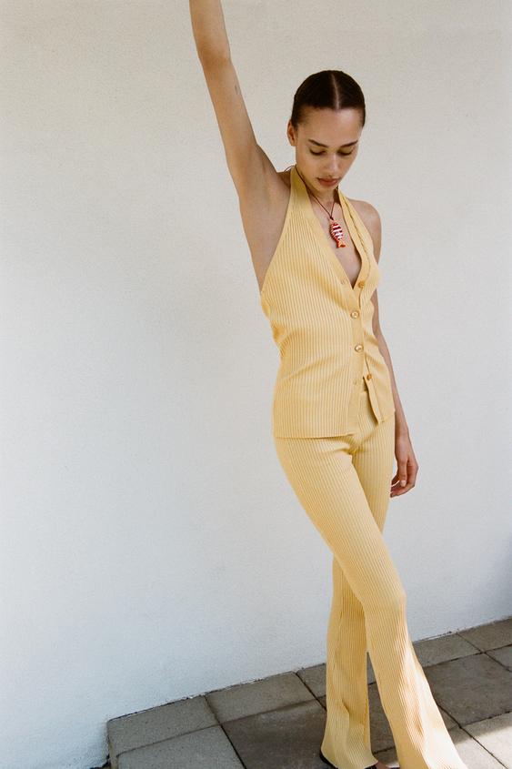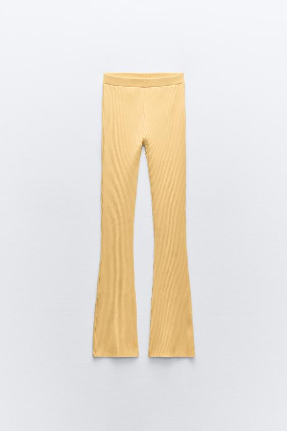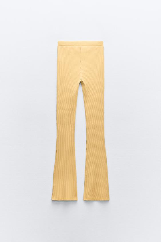 Pantalón de tiro alto con cintura elástica en rib a tono. Tejido en canalé. Bajo acabado flare.