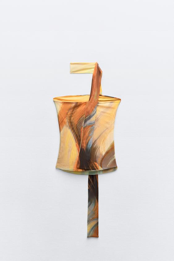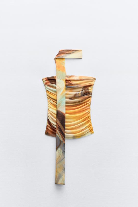 Top de escote recto y hombros descubiertos. Tejido drapeado. Detalle de lazada efecto fular en mismo tejido.
