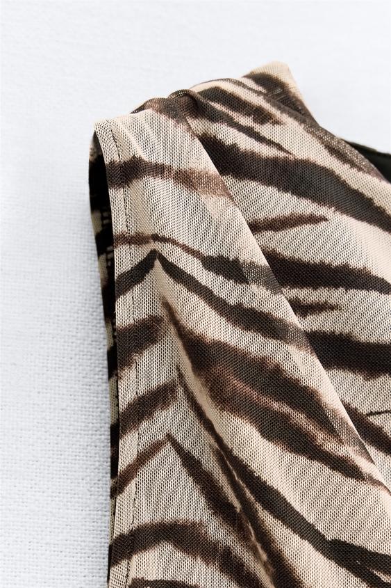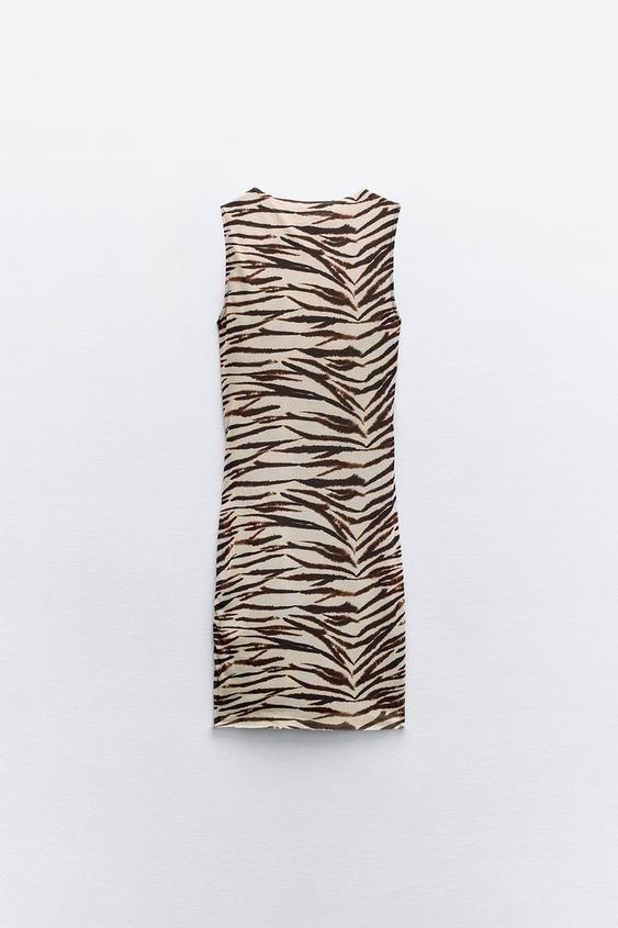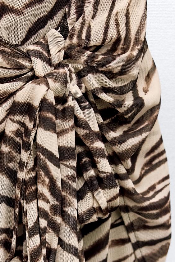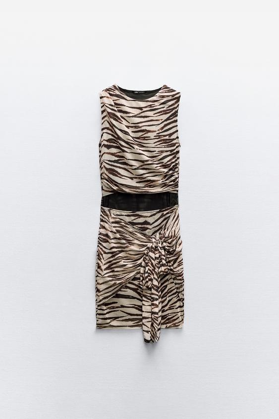 Vestido corto de cuello redondo y manga sisa. Abertura en cintura. Forro interior combinado. Detalle de frunces y tiras en mismo tejido.